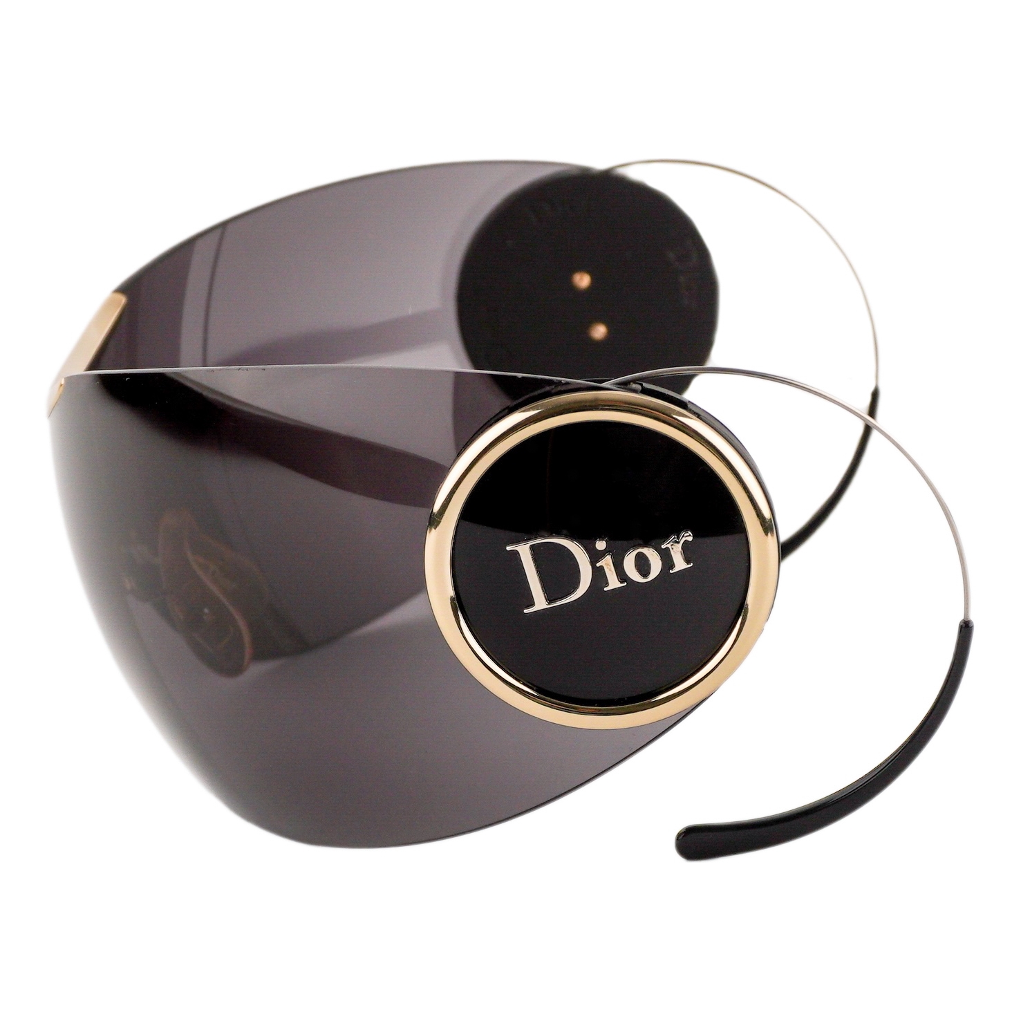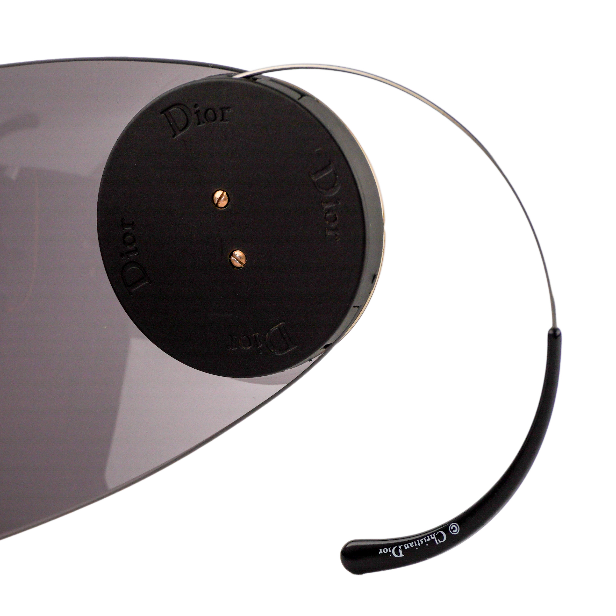 Futuristic oversized shield sunglasses by Dior, offering bold statement styling with a sleek wraparound design. Featuring a single continuous lens in deep grey, accented with polished gold-tone details and circular Dior logos at the temples, this piece blends avant-garde fashion with luxury craftsmanship.