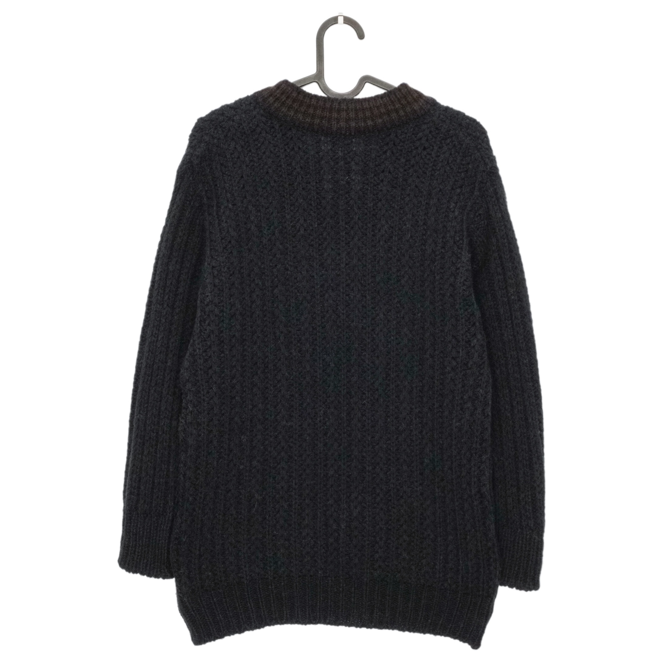 This Dries Van Noten sweater is a refined example of modern luxury knitwear. Crafted from a rich wool-blend, it features a deep V-neck design with a subtle contrast at the collar, adding visual depth to the chunky textured knit. The relaxed silhouette and thick ribbed trims make it both warm and stylish — a perfect piece for cooler seasons and statement layering.