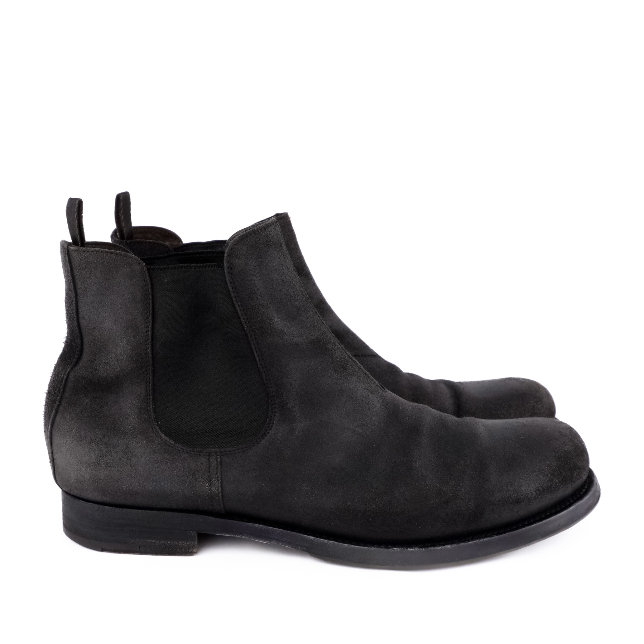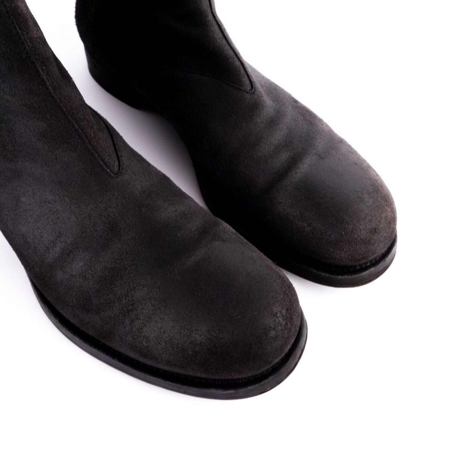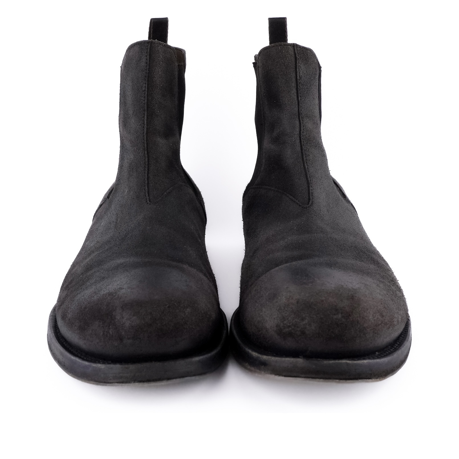 These Jil Sander Chelsea boots offer a refined take on a timeless classic. Crafted from soft black suede, they feature a minimalist silhouette with elastic side panels and pull tabs for easy wear. The slightly weathered suede adds character, while the clean design ensures effortless styling with both casual and tailored looks. A perfect choice for those who appreciate understated luxury and modern craftsmanship.