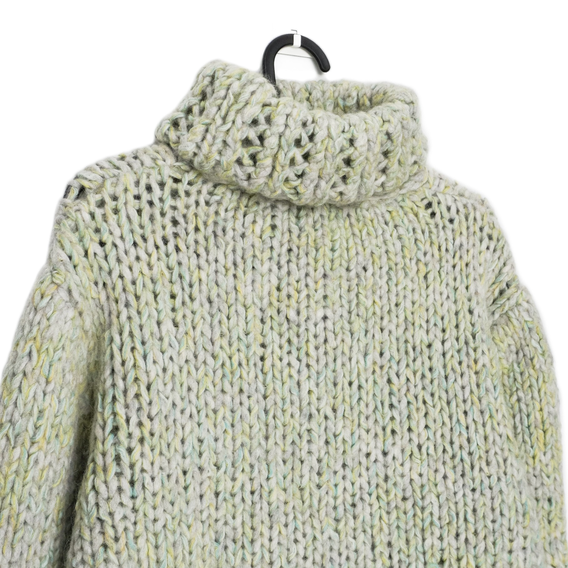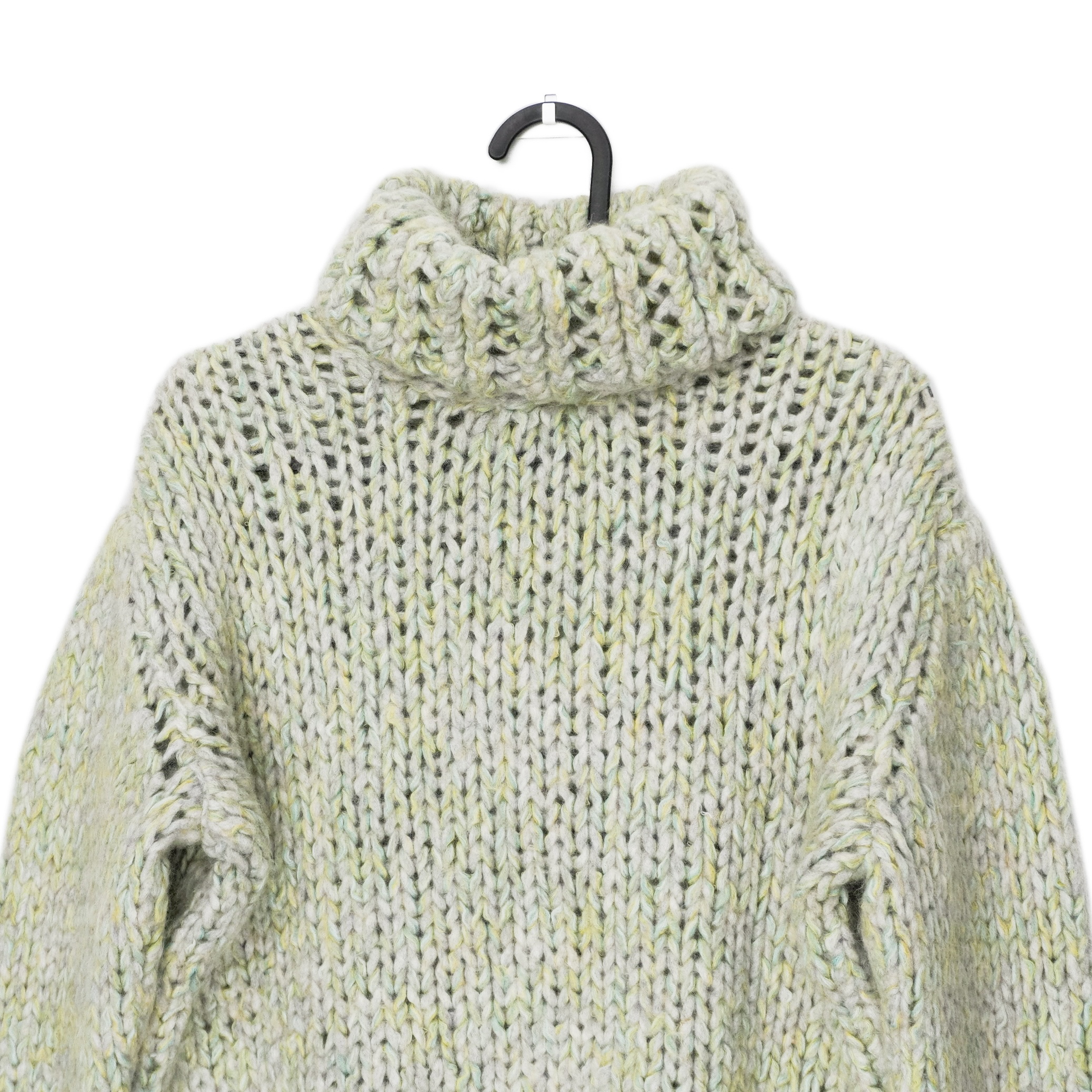 This Missoni chunky turtleneck sweater is a beautiful example of the brand’s signature artisanal knitwear. Hand-crafted in a thick, textured yarn blend, it features a soft melange of pale mint, cream, yellow, and grey tones that give it a natural, organic look. The oversized turtleneck and relaxed fit make it a perfect cozy statement piece for cold weather, combining luxury comfort with Missoni’s unmistakable aesthetic.
